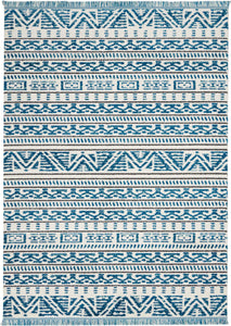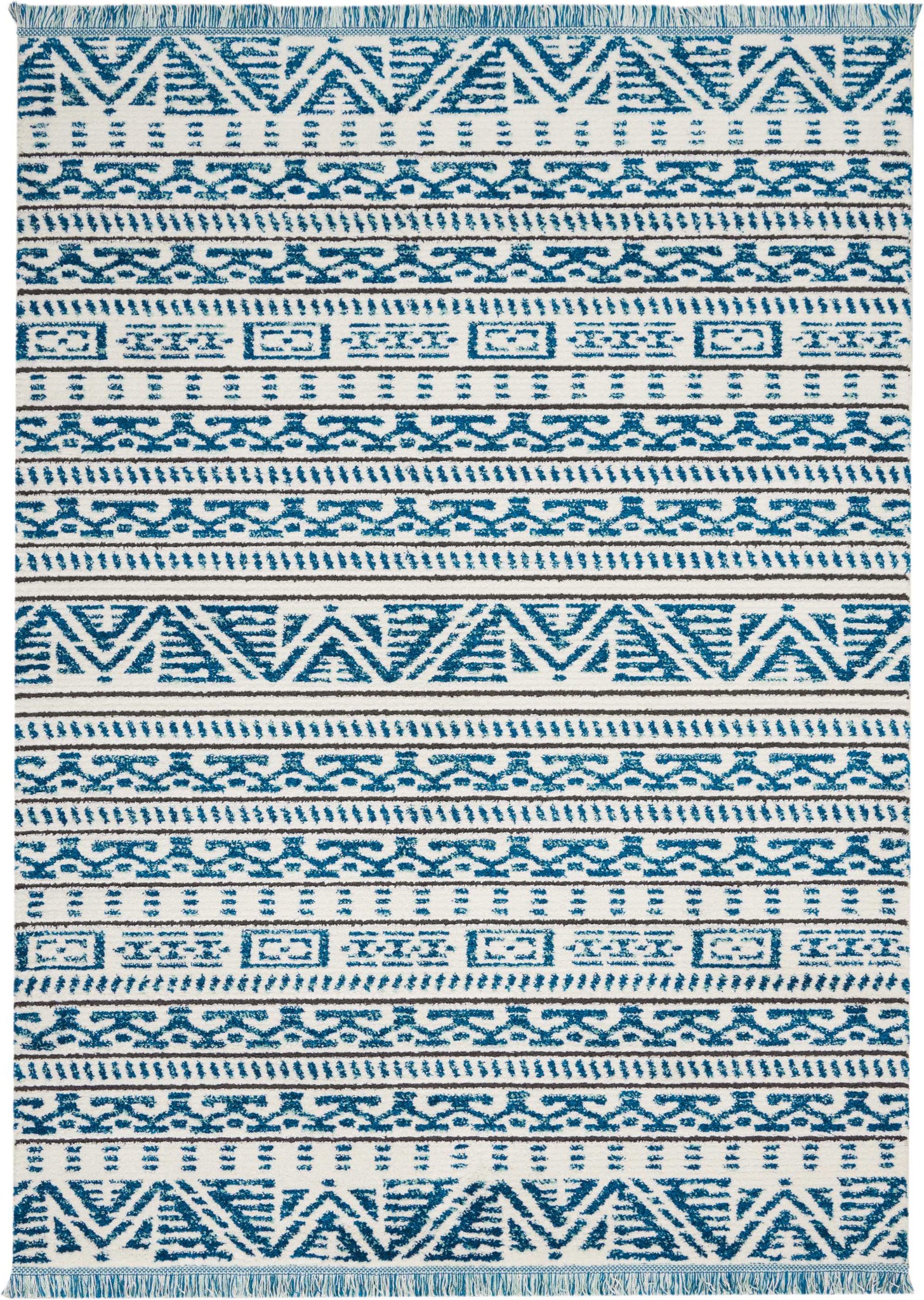 With its plush low-pile shag texture and fantastic fringes, this blue and white Kamala runner rug from Nourison is certain to steal the spotlight in any room it inhabits. Variations in the blue shag pile seem to shimmer with light in each row of tribal patterns. Power loomed for stress-free care and a marvelous durability.
