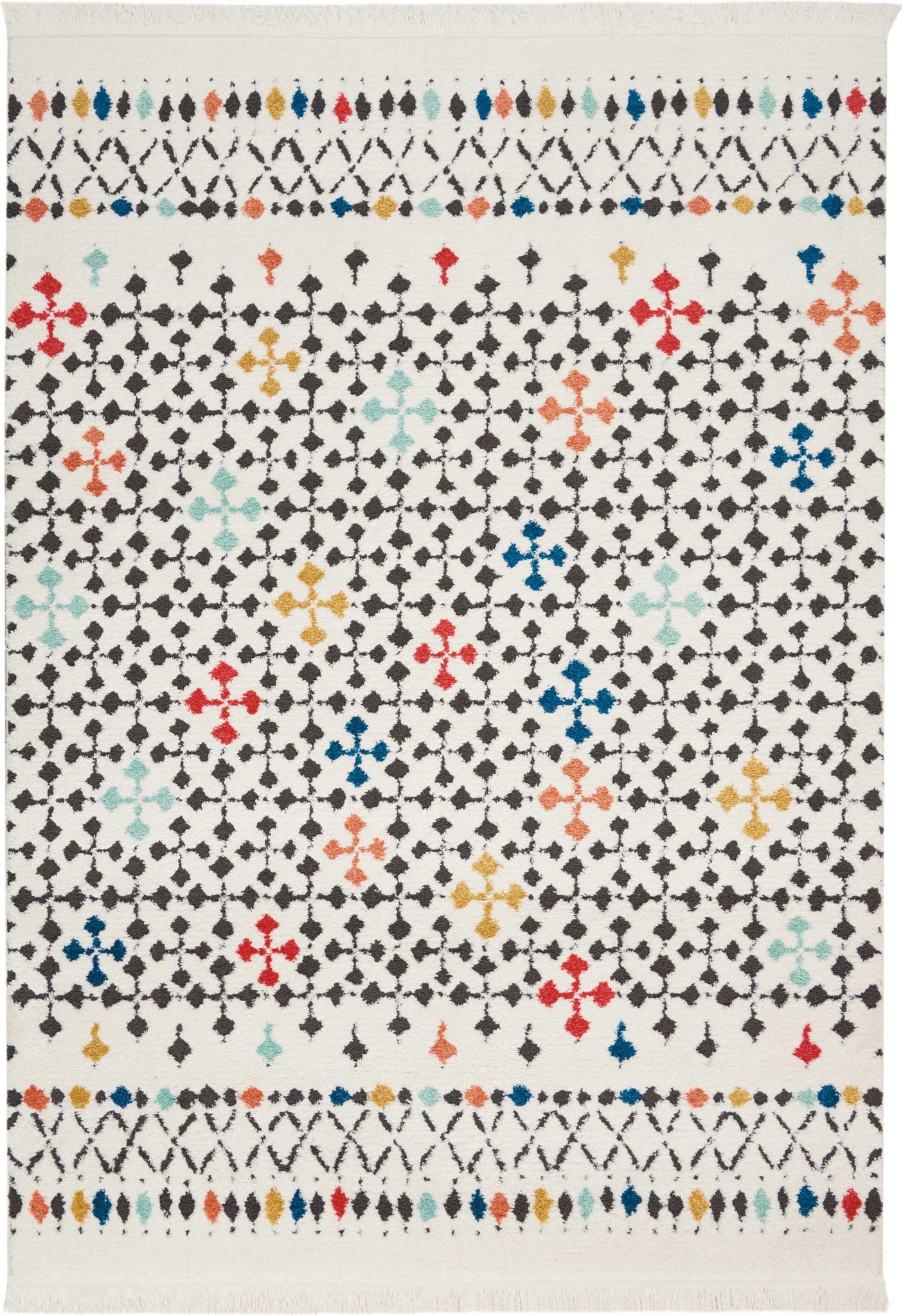 Lively colors and tribal design bring extra life and energy to this this Kamala runner rug from Nourison. Accents of blue, red, and gold intermix with the base charcoal patterns, with a soft low-pile shag texture and fringed edges, making this rug a fresh and fascinating focal point in any interior. Power loomed for a lasting quality and touchable texture.