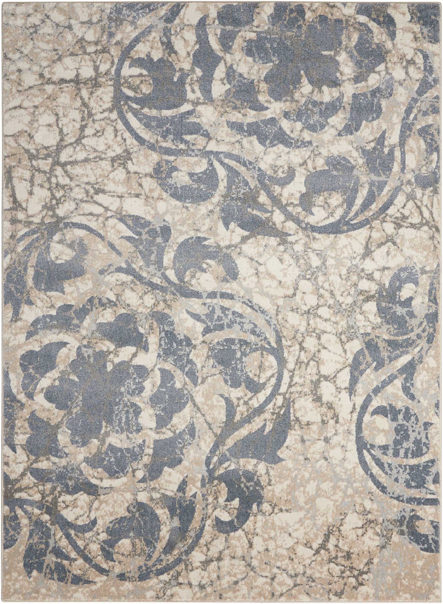 Marvelous marbled patterns creates the look of an elegant floral mosaic on ancient stone. Slate blue tendrils with distressed beige and grey details appear in bold relief against a richly textured ivory ground. This Maxell Collection design turns a contemporary rug into a vintage classic.
