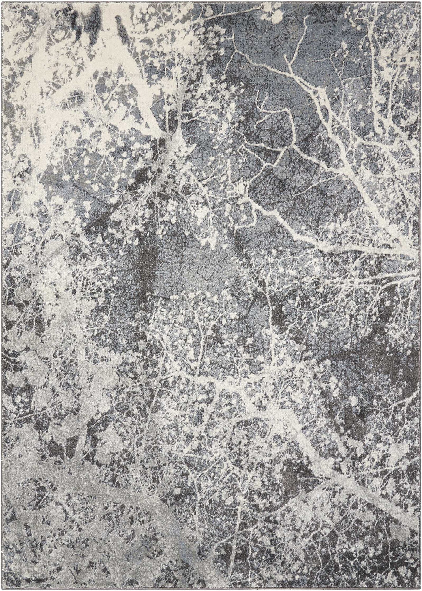 Deep shades of ombre grey and blue loom in the background of white-silhouetted branches in this enchanting forest scene. Incredible detail and use of shading on a silky cut pile make this a dramatic centerpiece for your entryway, hallway, or anywhere in the home that needs an extra styish touch.
