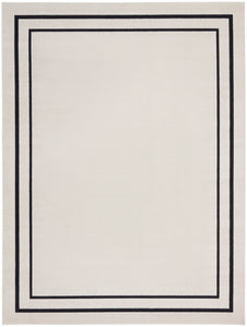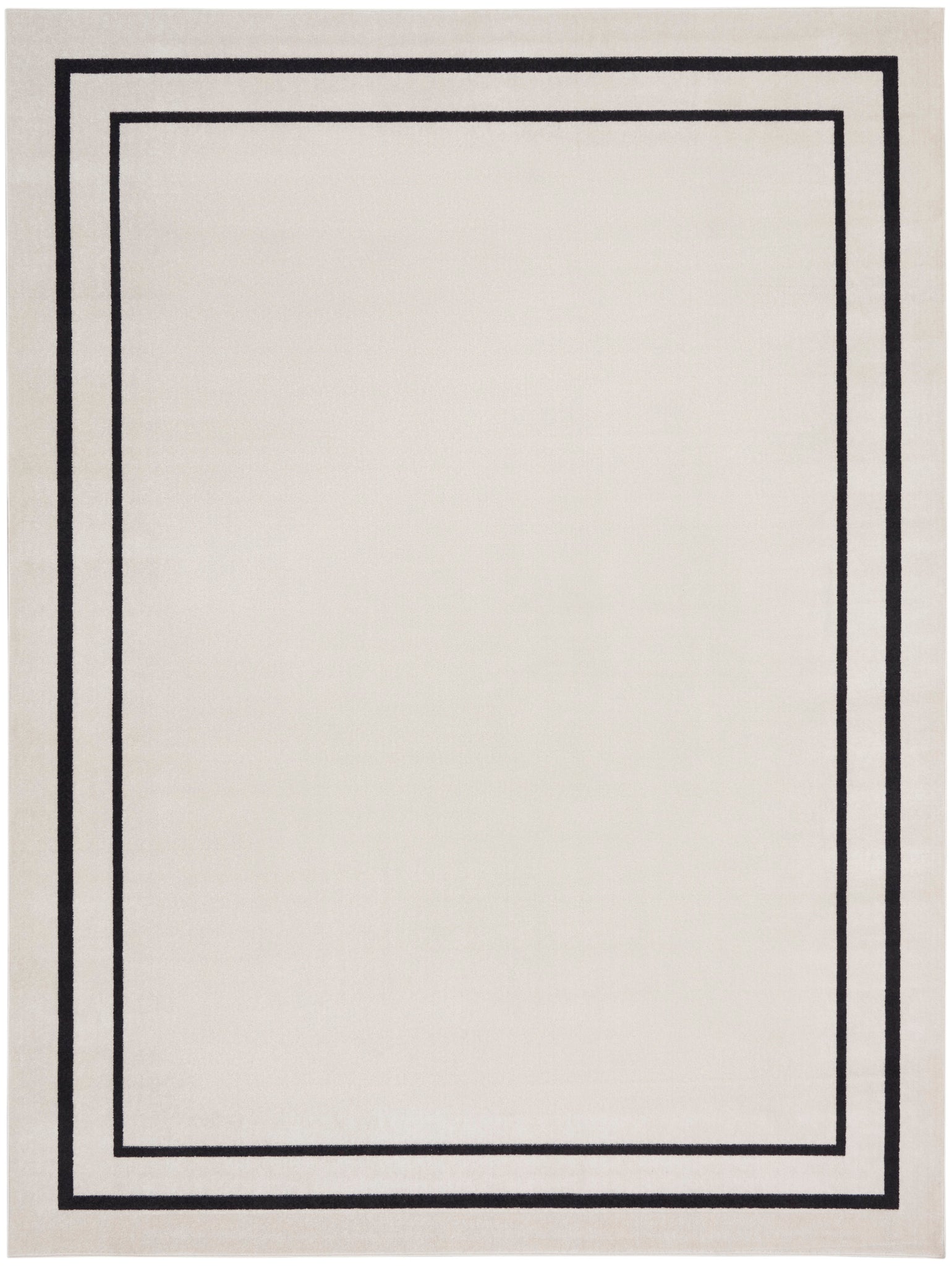 Add color and definition to your patio conversation space or indoor area with this contemporary ivory and black outdoor rug from the Nourison Essentials Collection. The double bordered rug design is made with softly textured, low-profile polypropylene yarns that stand up to heavy foot traffic. An ideal choice for busy households, this kid and pet-friendly rug does not shed and cleans up easily: hose-rinse spills and air-dry. To extend the life of your rug, bring it inside during extreme weather.