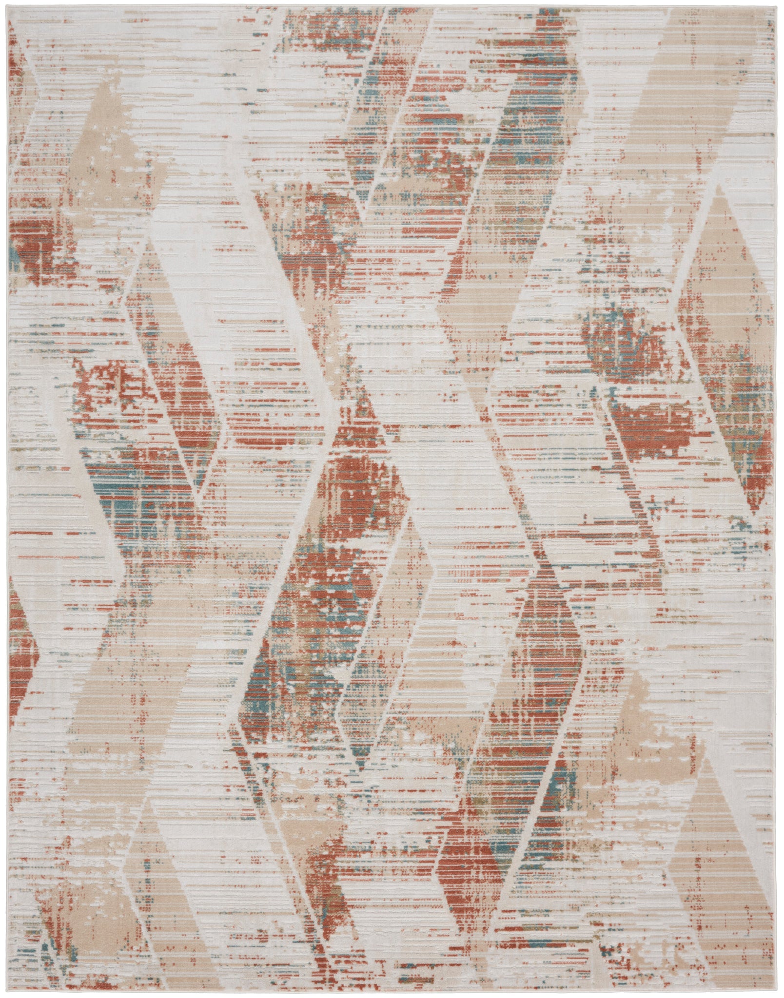 For a standout addition to your modern décor, try placing this abstract rug from the Thalia Collection to your living room, bedroom, dining room, or kitchen. The cream, ivory, red, and blue multicolor zig-zag design, with high-low pile framed by metallic serged edges, adds an intriguing layer of depth with a distinctively urban edge. Machine-made from kid and pet-friendly, easy to clean fibers.