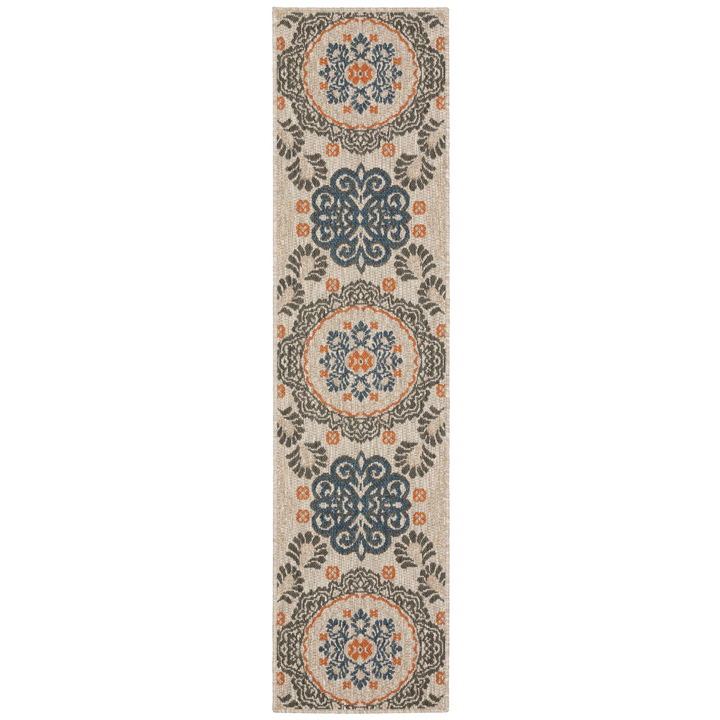 The Latitude collection showcases sophisticated designs ranging from traditional tile and medallion patterns to simple modern borders and geometrics. Multi-colored yarns in neutral grays, accented by tones of deep navy and vibrant persimmon, add texture and a pop of color underfoot. Machine-woven of polypropylene, Latitude is easy to care for and can be used both indoors and out.