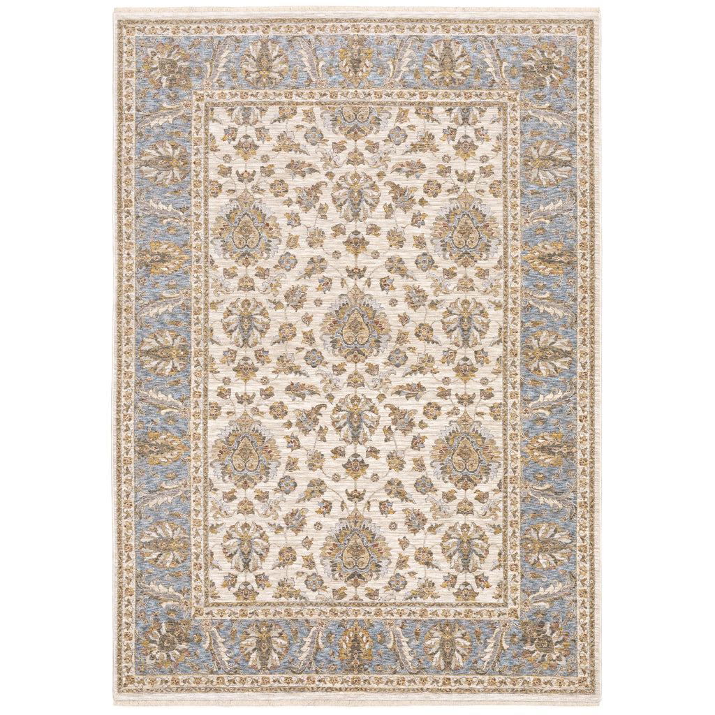 Maharaja is a study in understated elegance. This million point collection is full of sophisticated traditional designs that have been re-imagined into a lovely new color palette. Timeless neutral tones alongside mellow shades of bluestone and muted amber offer subtle treatments for intricately detailed patterns. These beautiful rugs are powerloomed of incredibly soft, space-dyed polyester.